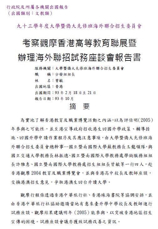 香港試務工作由珠海大學改由我駐港機構辦理,增訂「香港」簡章。試務工作由珠海大學改由香港事務局辦理香港事務局以「海華服務基金」名義對港招生,報名地點設在尖沙咀彌敦道的海防大廈7樓