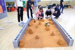 參賽學生們正進行火星車避障及火星車降落大賽的測試 東海大學支持火星任務,並結合跨科系合作專區展覽,除了利用科技打造火星任務展場,現場並有火星「無人農場」,花朵植物完全由機器人做精準照護,不但節省資源又更有效率;「火星綠藻屋」利用藻類進行廢水淨化以及產生氧氣,而循環鏈可以養殖魚蝦,讓未來火星殖民更真實。現場另有心肺運動遠距監控系統及太空下肢訓練體驗,及火星仿生建築展示。琳瑯滿目的展示也讓參賽選手和參觀民眾彷彿走入火星科技之旅般,身歷其境。