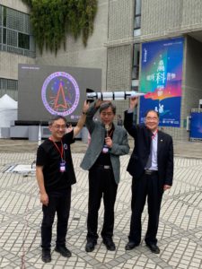 東海大學副校長王立志(右起)、科博館館長孫維新及東海大學生科系教授趙偉廷,重現探索者一號進入衛星軌道後,在記者發布會上展示火箭模型的姿勢。 東海大學生命科學系趙偉廷教授也是活動主辦人表示,最熱門的火星車降落大賽今年採用無人機釋放方式,難度增加,但更接近任務真實度,隨著每一組的起飛和降落,每一秒鐘都讓大家充滿期待和驚奇。火星車避障賽今年擴大火星場域,高中生徹底展現程式編碼能力以及實際障礙物的應變設定技巧。火星任務還有火星科展項目,參賽學生必須利用科學理論來解決火星上會遇到的問題,從產生水和氧氣到糧食以及醫藥等,學生們把課本裡的知識充分運用來解決問題並現場展演與民眾互動,氣氛熱烈充分發揮科普精神。