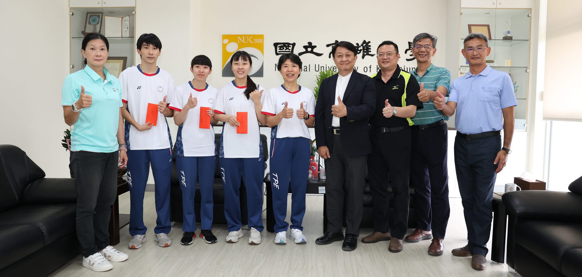 陳啓仁代表校方慰勉王明月師徒4人辛勞,帕運期間每次出賽他都緊盯螢幕掌握狀況,讚許精彩表現「讓世界看到台灣、看到高大」;也強調高雄大學積極發展特色運動,持續發掘與培育更多優秀學子前進世界舞台發光發熱。行政副校長吳行浩、主任秘書潘欣泰、體育室主任暨運技系主任林季嬋、運健休系主任張志成共同出席祝賀。 運動競技學系(運技系)教授兼學務長王明月長期指導田曉雯等3位徒弟,此次更擔任我國桌球代表隊總教練重責,帶領全隊摘下3銀2銅亮眼成績。王明月說,由於大會安排女雙賽程最早登場,因此田曉雯、林姿妤率先打頭陣,「壓力山大」但不只扛住,更頻頻告捷帶動全隊士氣,其心理素質與韌性值得嘉許。 田曉雯、林姿妤雙姝搭檔,獲得女子雙打WD20級銀牌,曉雯個人再拿下TT10級銅牌,兩人繼續攻讀運健休系碩士班;學弟蘇晉賢為運技系大二,此次擔任陪練員協助兩位學姐賽前最後衝刺、奪牌功不可沒。