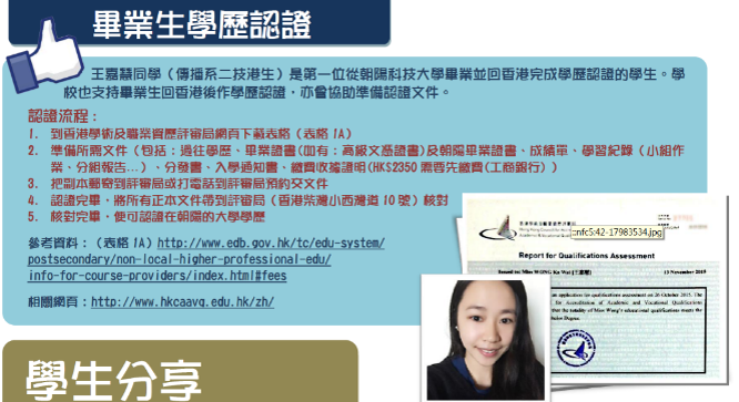 持香港高級文憑或副學士學生於錄取後透過本校抵免學分之審查後,得以提高編階直接於3年級就讀,修讀兩年即取得我校學士文憑;且通過香港學歷評審局審核,等同香港學歷資歷架構5級(educational qualification meets the standard of a local Bachelor Degree)