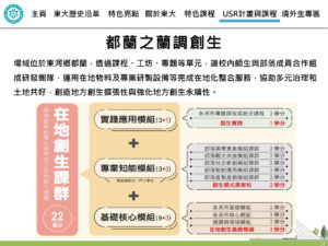 校自2017年起籌備USR計畫,已經邁入第6年,2023年起聚焦在培養USR實踐精神的跨域自主人才、協力區域產業提升以及打造臺東綠色文化永續基地,並以在地關懷、產業鏈結與經濟永續之議題,串聯SDGs。